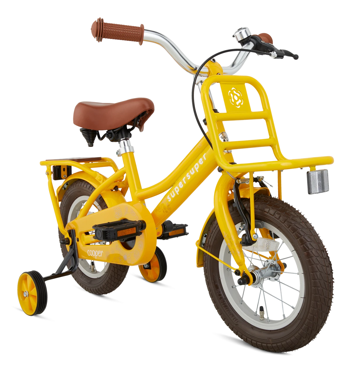 Fantastisk flot pigecykel i retro design i dejlig varm gul farve med matchende mørkebrune cykeldæk, samt bred og komfortabel saddel i brun og håndtag i samme farve. Cyklen er udstyret med bambus plader på bagagebæreren og frontladet, som giver cyklen en trendy og miljørigtig karakter. Cyklen leveres med aftagelige støttehjul, der sikrer at den lille cyklist får lært at cykler trygt og sikkert uden at være bange for at vælte. Denne Cooper Bamboo pigecykel er derfor ideel som barnets første rigtige cykel.
