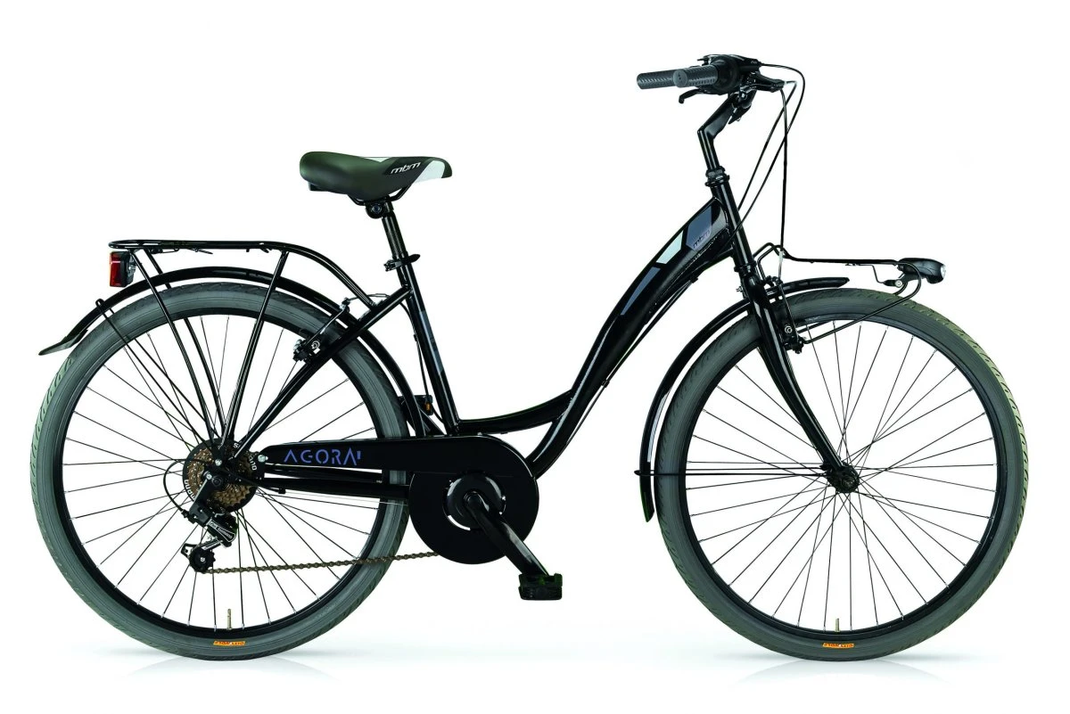 6 hastighed. Shimano Revoshift, overdimensionerede rammer med fladede rør, aluminium V-bremser og bremsehåndtag, aluminiumsnav, batteribelysning, frontpakningsbærer.