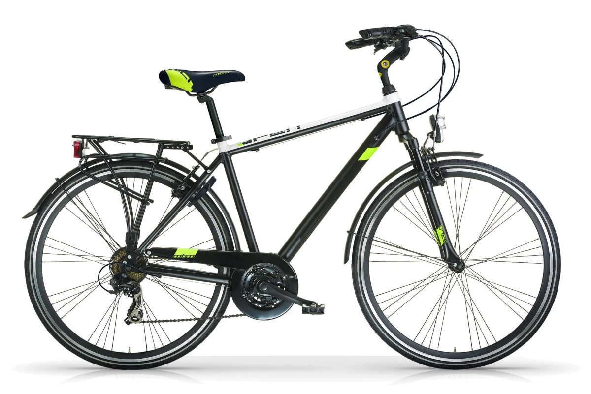21 hastighed. Shimano Tourney Sti , ophængsgaffel, batteribelysning, Alu V-bremser og bremsehåndtag, dobbeltvæggede fælge med dobbeltvæggede fælge og aluminiumscentre, aluminiumspakker, robust hestesko, justerbar stamme, reflekterende dæk.