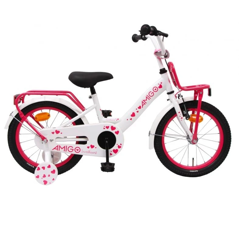 Amigo Sweetheart Girls ‘Bike Amigo Sweetheart erobrer hjertet af enhver lille pige i et blik. På denne koselige cykel med sidehjul praktiserer de trappen og styringsbevægelser sikkert. Hvis de får fat på dette, kan du nemt fjerne sidehjulene, og de er klar til den rigtige ting! Kæresten er udstyret med en stærk knivspids og coaster bremse, høj cykelklokke, praktisk frontbærer og reflektorer, som de skiller sig ud i mørke. øje for detaljer For en der ønsker at skille sig ud, handler det om detaljerne. Det er fint med Amigo Sweetheart! Med denne super smukke cykel stjæler du alles hjerte. Der er super sjove mønstre på rammen, sidehjulene og endda på kædebeskyttelsen. Du er en rigtig hjerte erobrer med denne cykel! lukket kædevagt Ved sikkert at afskærme kæden får du ikke beskidt tøj. Det sikrer også, at kæden ikke bliver beskidt og fortsætter med at fungere godt. Men det er alt sammen et sideproblem, når du ser, hvor smuk kædevagten er. Du vil allerede møde hjerterne, og det uden cykling. Så kom hurtigt på cyklen og lad alle nyde hjerterne! sidehjul for stabilitet Intet er så vanskeligt som at finde balance på cyklen. Derfor er disse sidehjul perfekte til dem, der ønsker at lære at cykle. Du kan øve dig på trapper og styre gennem sidehjulene, så du bliver vant til det. Hjul af høj kvalitet er lavet af stål og plast og tilbyder derfor en masse støtte. Cyklen til dig Leder du efter en smuk og praktisk cykel, som du kan cykle overalt? Så er Amigo Sweetheart den ideelle cykel til dig! Uanset hvor du går, kan du altid tage dine ting på det forreste transportør. amigo hos Amigo har vi en cykelkammerat til alle! Ægte hollandske design, og det til en meget venlig pris. Med disse muntre cykler foretager børn deres første små ture gennem gaderne. De robuste træningshjul hjælper børnene med at holde deres balance, mens de vænner sig til trappen og styringsbevægelser. Cyklerne har en stabil ramme og fås i utallige farver og forskellige dækstørrelser. Vil Amigo være din nye bedste ven? Generelle specifikationer: Farve: hvidt/lyserødt køn: piger Materiel ramme: Stålvægt: ca. 12,4 kg dæk: sorte luftdæk Amigo M1500 16 x 2,0 tommer (50-305) fælge: Enkeltvæggede aluminiumsfælge Gear: 1 Specifikationer: Hjulstørrelse: 16 tommer rammestørrelse: 22 cm sadelhøjde: 53,5 cm (i den laveste position, målt fra jorden) Saddlehøjde Justerbar: Ja Specifikationer Inhibit: Type bagbremse: Fair Brak Type af bestemmelse: V-bremsespecifikationer Tilbehør: Chain Guard Side Wheels: Ja, aftagelig belysning: Forreste og bageste reflektorer med Bracket Bicycle Bell: Ja