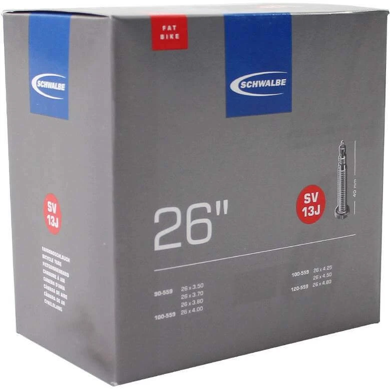 Schwalbe indre rør Fatbike 26 tommer fransk-SV13J/90-559, 100-559, 110-559, 120-559. De indre rør i Schwalbe er pålidelige. Cykelforhandlere værdsætter ham for hans høje pålidelighed. Hvert dæk pumpes op på fabrikken og testes i 24 timer på lufttæthed. Dækket holder lufttrykket længere. I produktionen kræver Schwalbe en meget høj butylandel og en meget høj renlighed af materialet. For eksempel bevarer Schwalbe indre rør lufttrykket betydeligt længere end andre indre rør. Det er et gruppe-i-mellembåndsystem: et indre tape i Schwalbe er ekstremt elastisk og passer på flere dækdimensioner. Som et resultat kaldes de grupper af indre rør. For eksempel det indre rør med nummer 19A for dækdimensioner fra 27,5 tommer til 29 tommer og for bredden fra 40 til 62 mm. Endelig er bandet 100% helt genanvendeligt. Især for fedtcyklen.