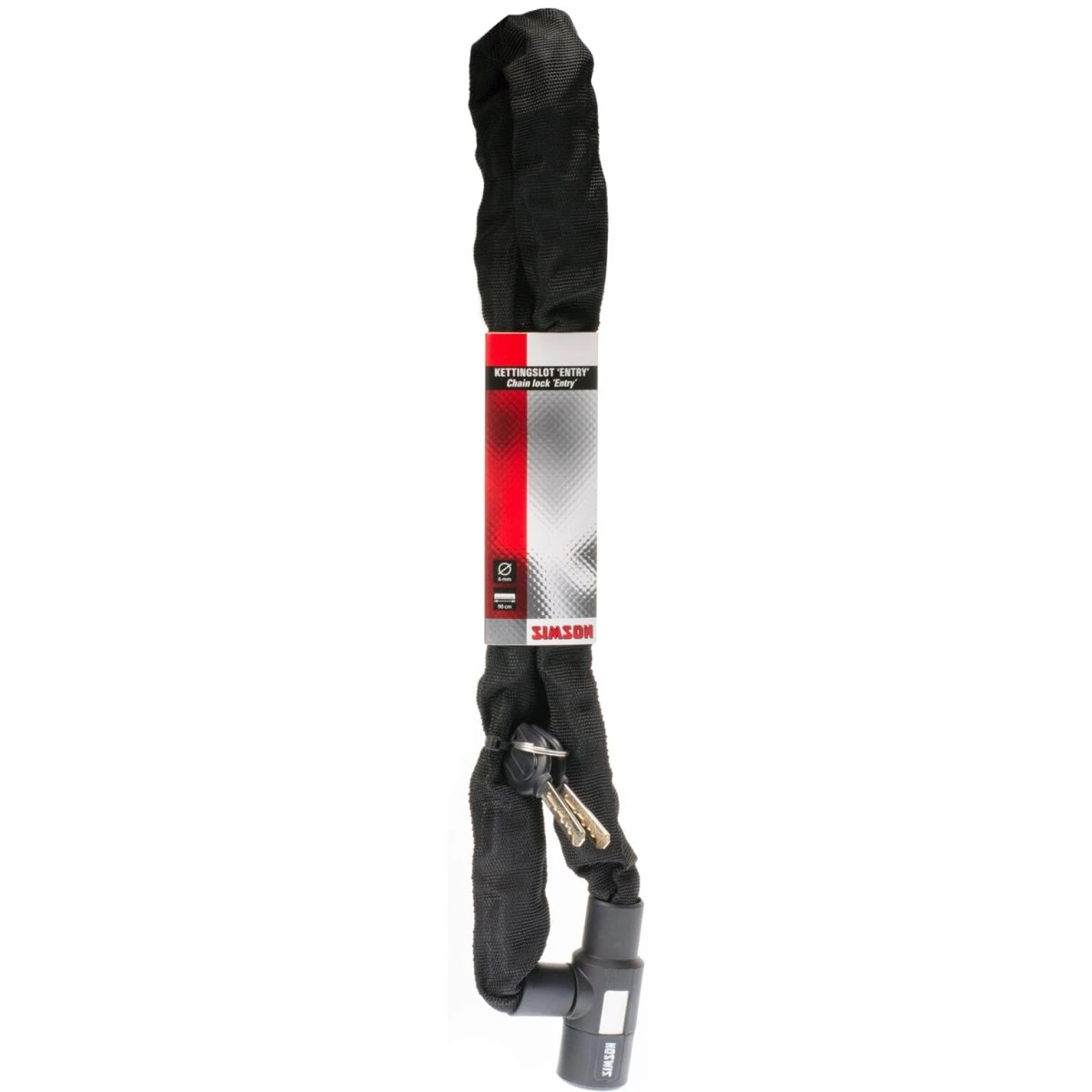 Simson Chain Lock -indgangen er en meget let og kompakt sort kædelås med tekstildækning for at forhindre skader på rammen. Med en tykkelse på 6 mm og en længde på 90 cm er kædelåsen kompakt og let at bære. Den integrerede lås sikrer optimal brugervenlighed for at kunne låse cyklen sikkert. Låsen leveres med to nøgler.